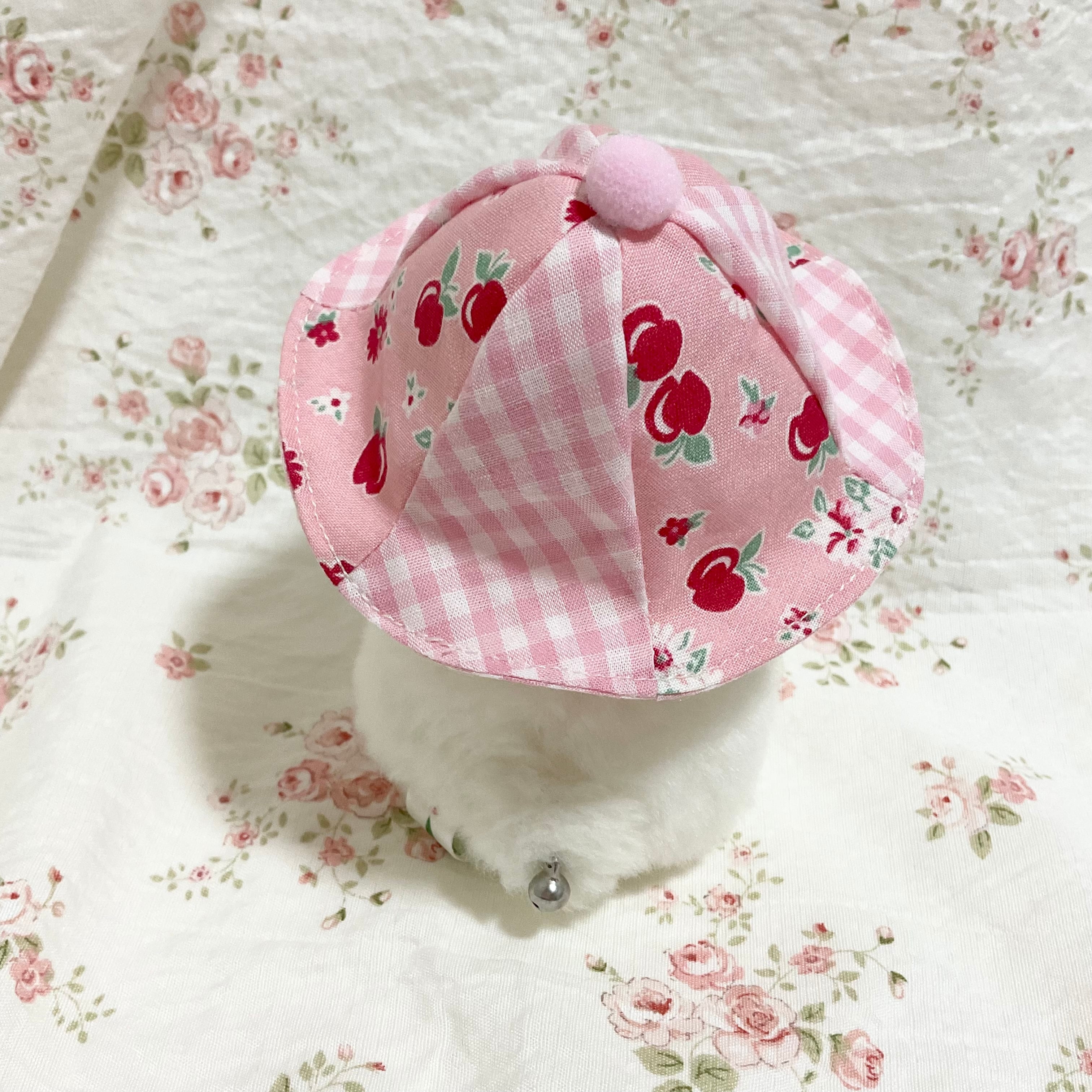 優しいピンクの生地に、小さなりんごが並んだとってもキュートな帽子です。同系色のチェック柄と合わせることで、まるでりんごたちがマーチをしているような、賑やかで楽しい雰囲気に仕立てました。