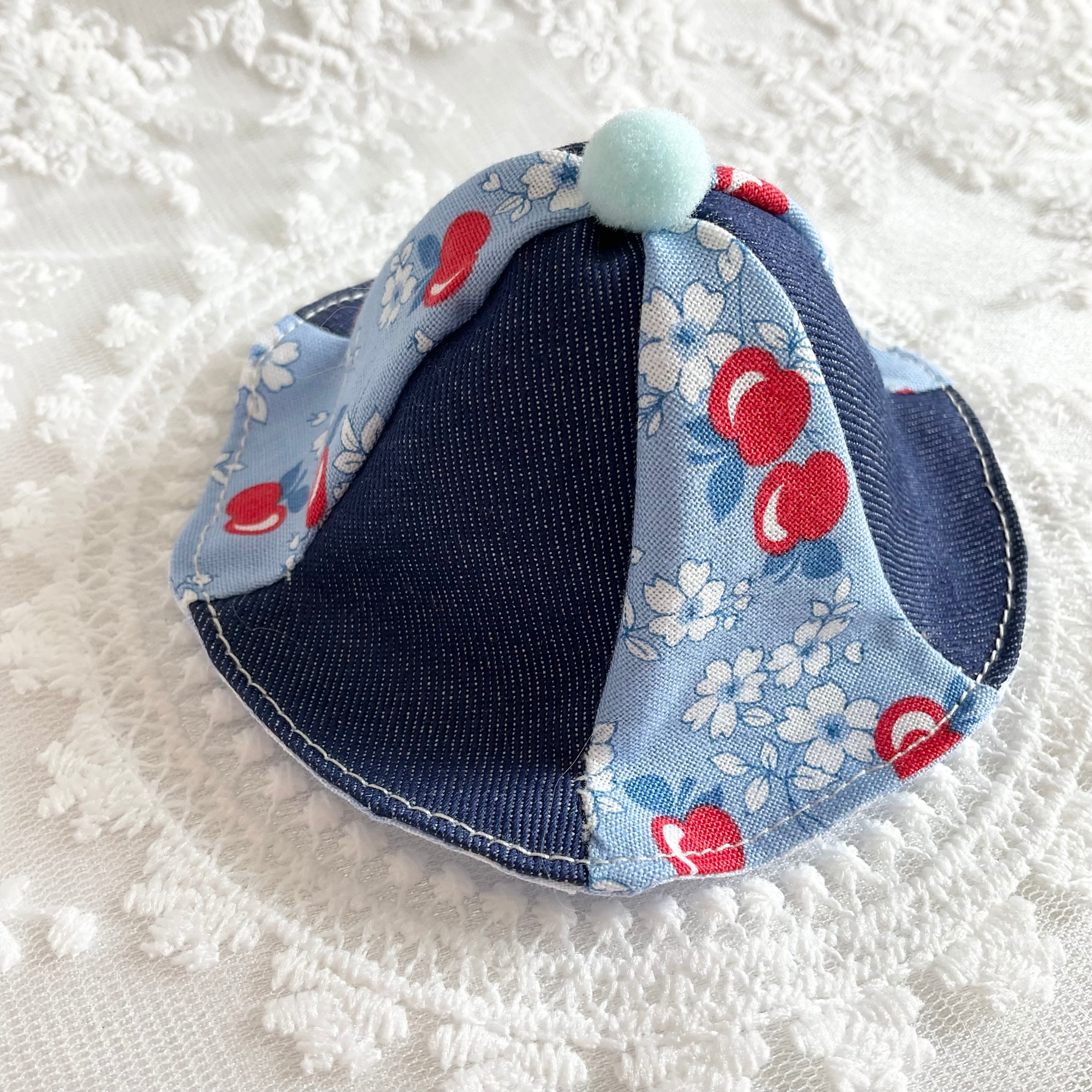 ぽんぽんデニムキャップ ごきげんりんご ブルー