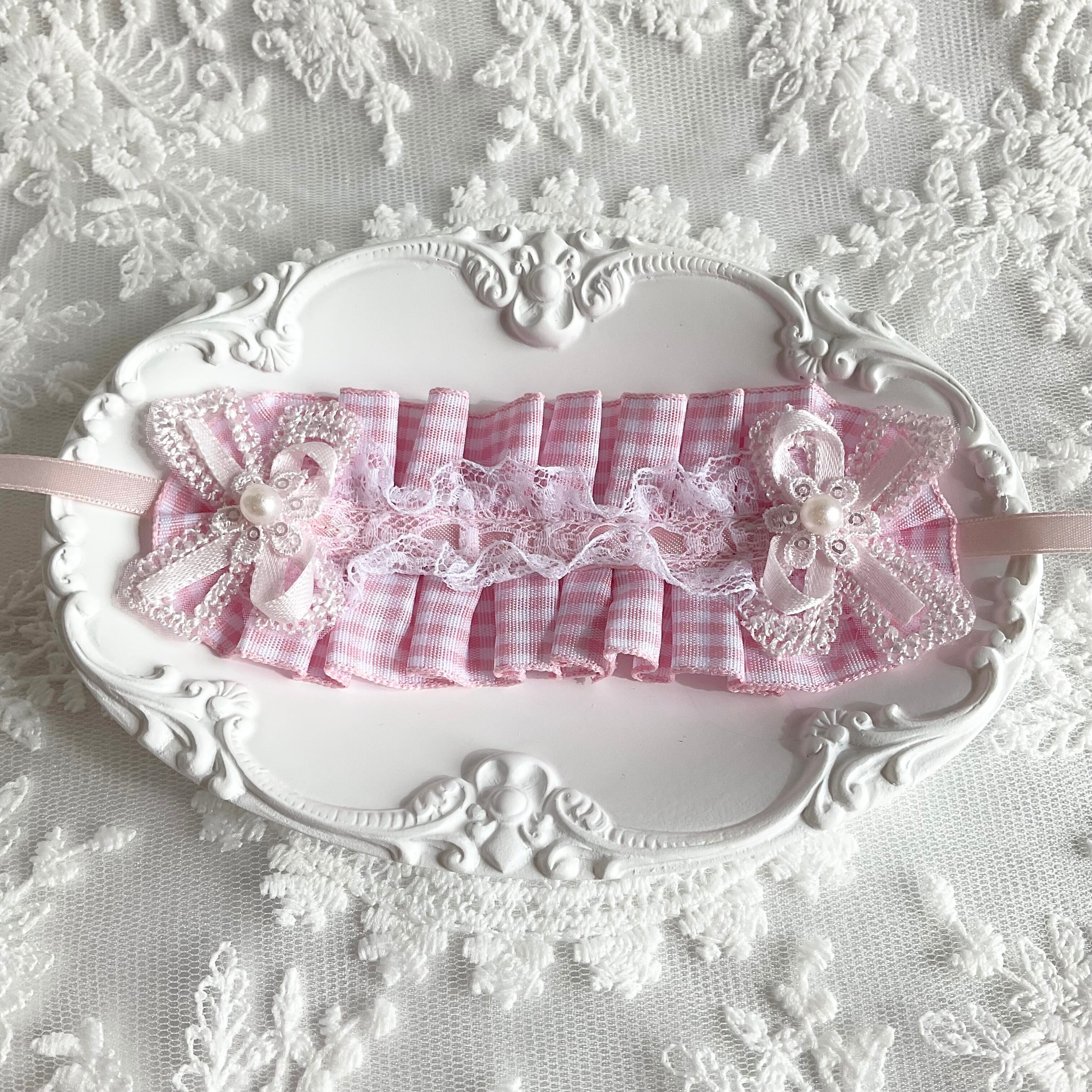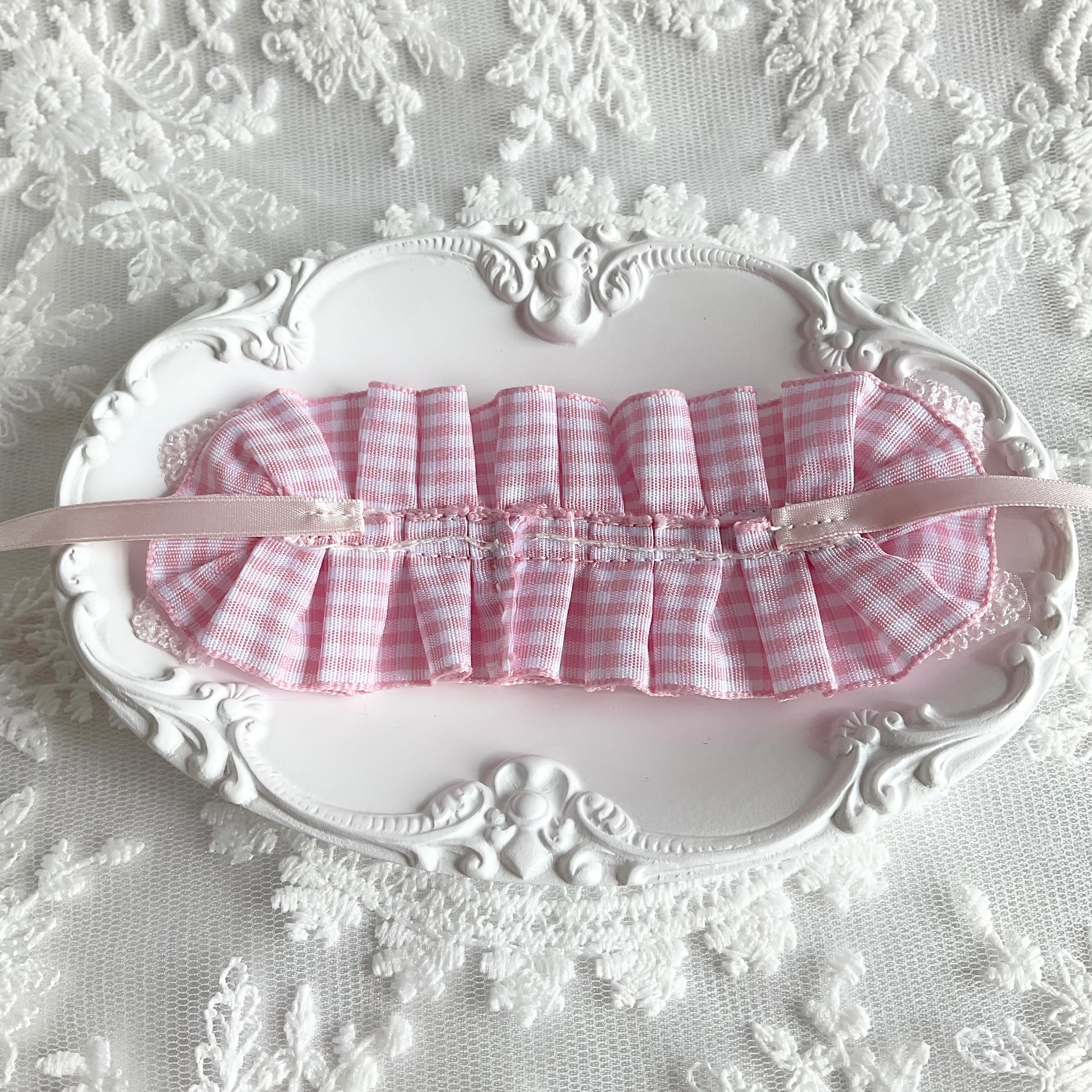 鮮やかなギンガムチェックに繊細なフリルレースを重ね、両サイドにはパールが上品に輝くリボンをあしらいました。