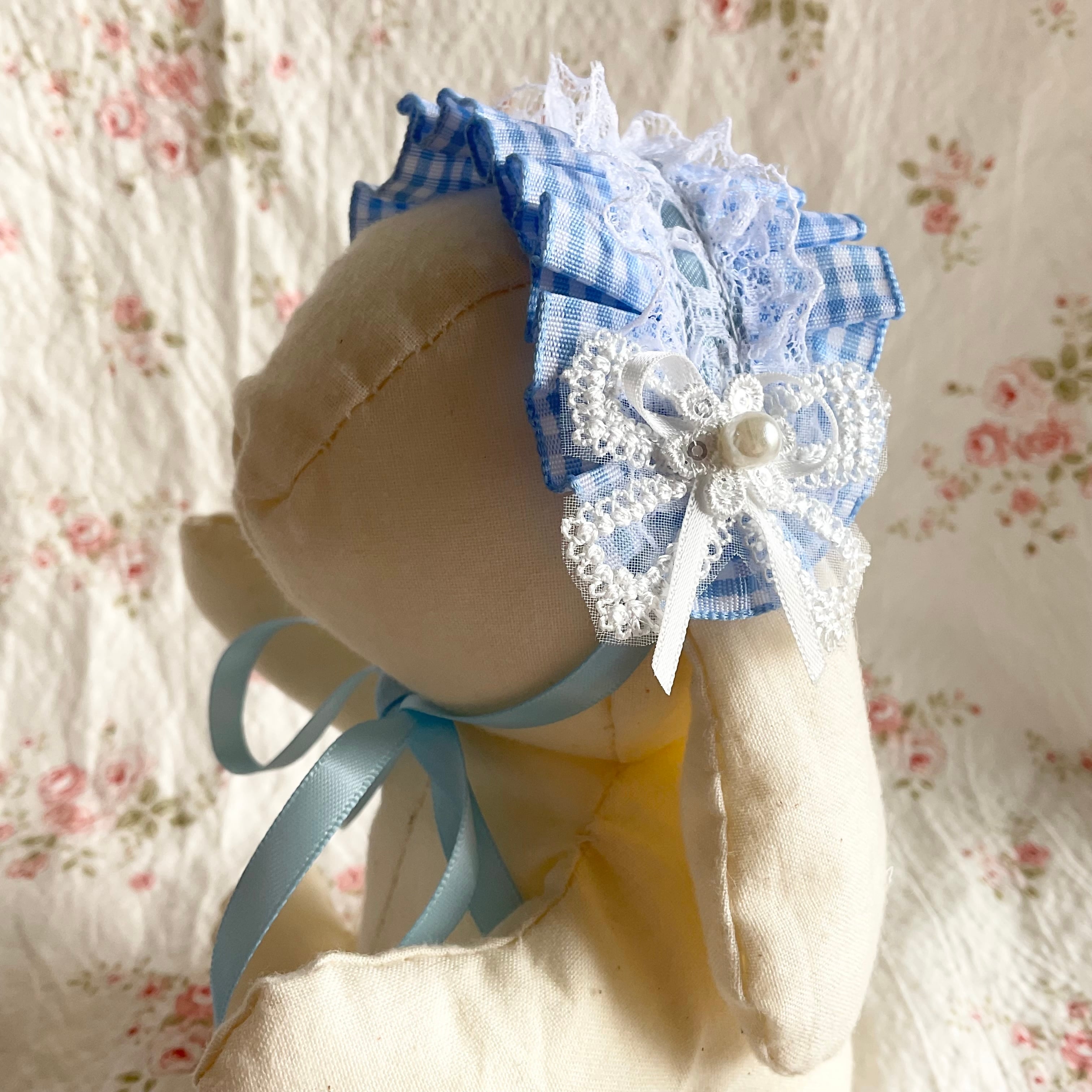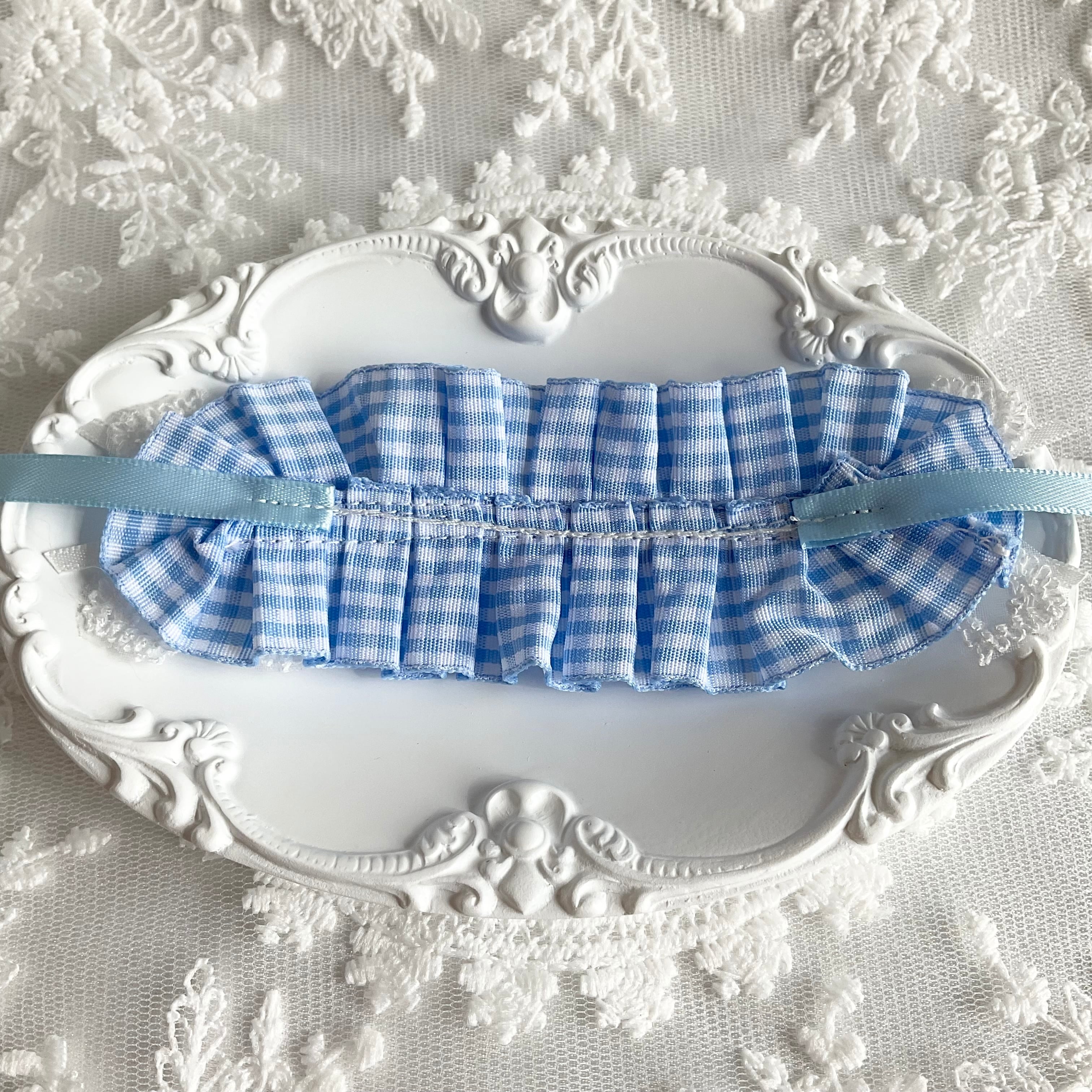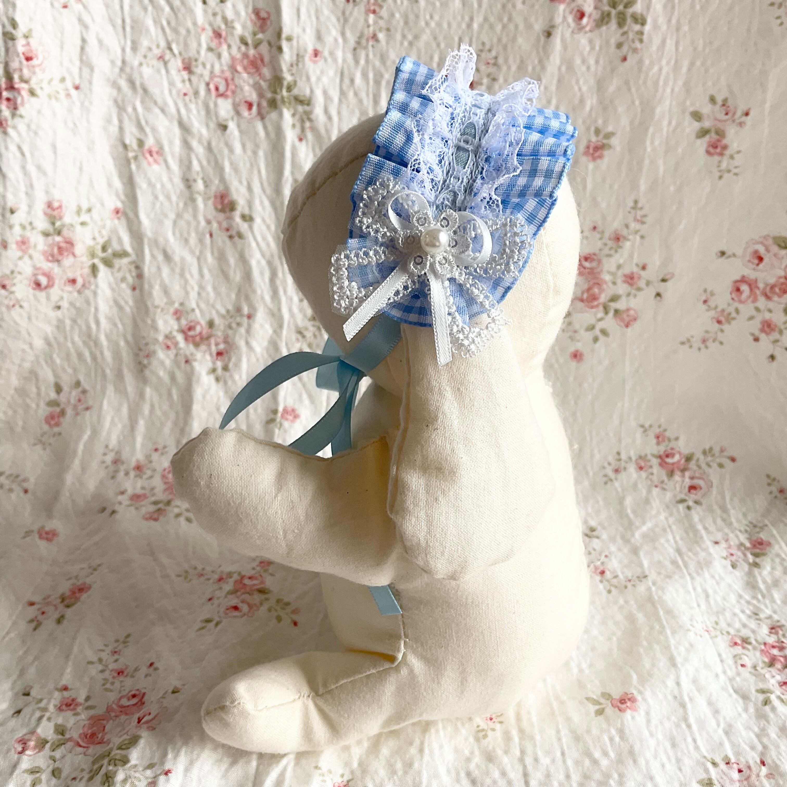 鮮やかなギンガムチェックに繊細なフリルレースを重ね、両サイドにはパールが上品に輝くリボンをあしらいました。