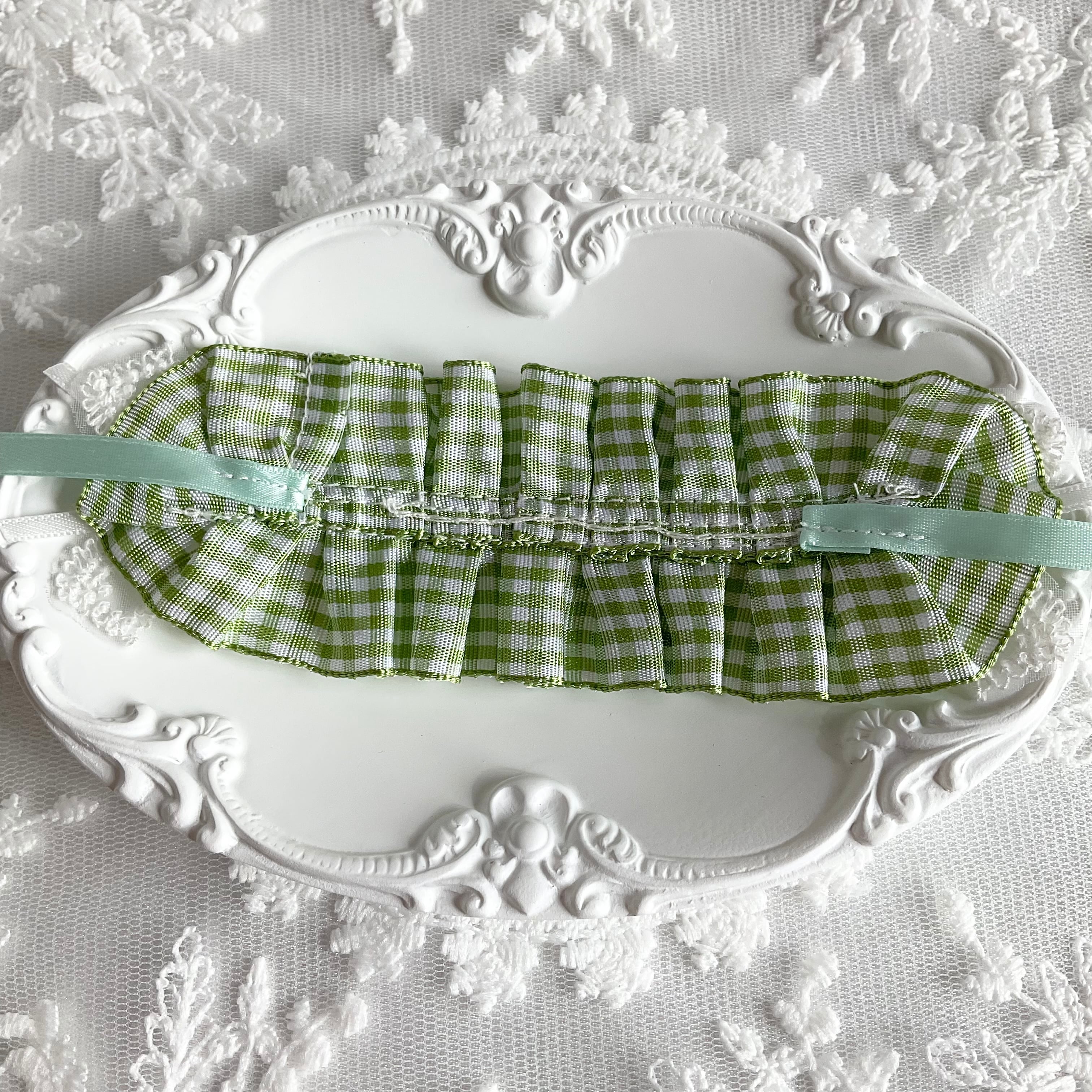 鮮やかなギンガムチェックに繊細なフリルレースを重ね、両サイドにはパールが上品に輝くリボンをあしらいました。